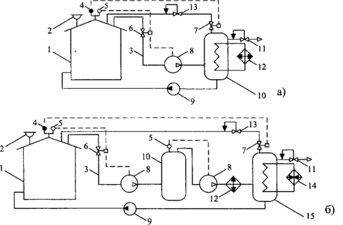 Рисунок 15 - Конденсационно-компрессорные системы УЛФ: а—с охлаждением сжатой газовой смеси; б—то же с двухступенчатым сжатием; 1 —резервуар с бензином; 2—дыхательный клапан; 3 — газовая обвязка; 4—датчик вакуума; 5—датчик давления; 6, 7—отсечные клапаны; 8—компрессор; 9—насос; 10, 15—емкость; 11—регулятор давления типа «до себя»; 12—холодильник; 13—регулятор давления типа «после себя»; 14—подогреватель; 15—емкость для конденсата