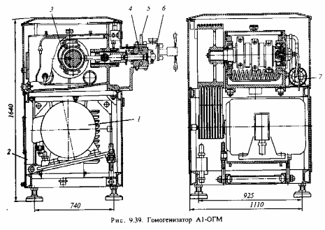 1 – электродвигатель; 2 – станина; 3 – кривошипно-шатунный механизм; 4 – плунжерный блок; 5 - манометрическая головка; 6 – гомогенизирующая головка; 7 – система смазки и охлаждения