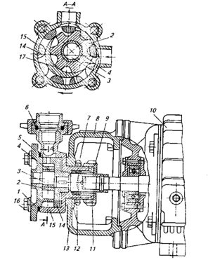 1 – прокладка; 2 – шестерня; 3 – палец; 4 – втулка; 5 – крышка; 6 – уплотнительное кольцо; 7 – гайка крепления корпуса насоса; 8 – кронштейн; 9 – гайка сальникового уплотнения; 10 – электродвигатель; 11 - нажимная втулка; 12 – сальниковое уплотнение; 13 – наконечник вала; 14 – ротор; 15 – корпус насоса; 16 – гайка крепления крышки; 17 – серповидный выступ.