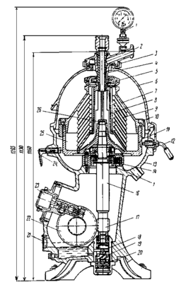 1 – манометр с мембранной приставкой; 2 – отводящая коммуникация; 3 – гайка для крепления приемно-отводящего устройства с крышкой; 4 – питающий патрубок; 5 – напорный диск; 6 – крышка сепаратора; 7 - крышка барабана; 8 – тарелкодержатель; 9 – конические тарелки; 10 – затяжное кольцо барабана; 11 – основание барабана; 12 – стопор; 13 – станина; 14 – центрируемые винтовые пружины горловой опоры; 15 – гнезда корпуса; 16 – веретено; 17 – шестерня; 18 – опорные шарики; 19 – пружина подпятника; 20 – стакан подпятника; 21 – указатель уровня масла; 22 – винтовое колесо; 23 – валик тахометра; 24 – тормоз (два); 25 – шламовое пространство; 26 – предохранительная гайка