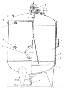 В танке смонтирована мешалка. Ее верхние и нижние лопасти соединены между собой наклонно расположенными тягами. Мешалка установлена на упорном шарикоподшипнике, который закреплен в стакане привода, находящегося на верхнем днище рабочего резервуара; приводится в действие электродвигателем. Все элементы мешалки разъемные, что позволяет без особых затруднений осуществлять монтаж и сборку.