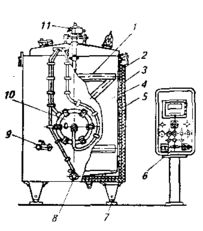 1 – мешалка; 2 – теплоизоляция; 3 – теплообменная рубашка; 4 – внутренний корпус; 5 – наружный корпус; 6 – пульт управления; 7 – ножки; 8 – патрубок наполнения-опорожнения; 9 – пробоотборный кран; 10 – люк; 11 – привод мешалки