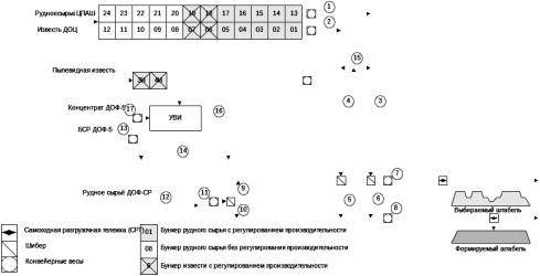 Пылевидная известь в концентрат ДОФ-5 вводится весодозаторами № 3,4 в пропорции к поступающему концентрату по конвейеру №16-а в автоматическом или ручном режиме (согласно технологической инструкции ТИ 101-ГОП-15-2004).