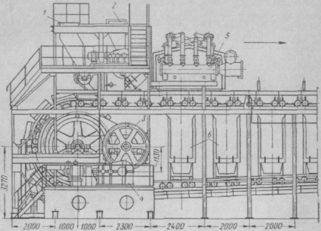 1 – бункер для шихты; 2 – питатель; 3 – ведущие звездочки;