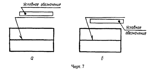 б) под полкой линии-выноски, проведенной от изображения шва с оборотной стороны (черт. 7б).