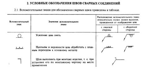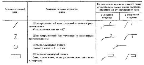 Вспомогательные знаки для обозначения сварных швов приведены в таблице.