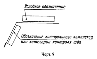 «Черт. 9. Обозначение шва сварного соединения с установленным контрольным комплексом или категорией контроля шва»