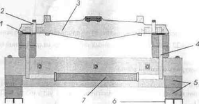 Рисунок 8.24 — Электромагнитное намагничивающее устройство МСН 31: 1 — полюсный наконечник; 2 — ловитель; 3 — надрессорная балка; 4 — стойка магнитопровода; 5 — основание; 6 — полоз; 7 — электромагнит.