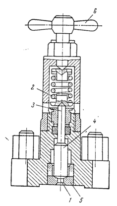Рисунок 1 – Гомогенизирующая головка: 1 – канал, 2 – пружина, 3 – стержень; 4 – клапан; 5 – седло; 6 – регулировочный винт