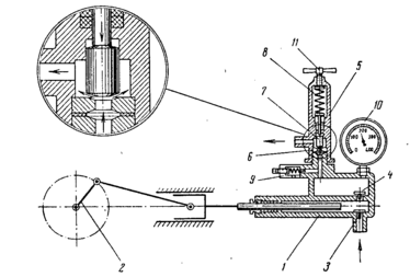Рисунок 3 – Схема гомогенизатора: 1 – насос; 2 – кривошипно-шатунный механизм; 3 – всасывающий клапан; 4 – нагнетательный клапан; 5 – гомогенизирующая головка; 6 – седло; 7 – клапан; 8 – пружина; 9 – предохранительный клапан; 10 – манометр; 11 – регулировочный винт