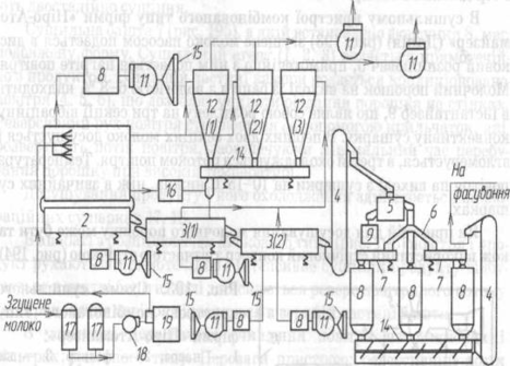 Служит для сушки цельного молока и перегонки. Сушка происходит в течение двух стадий. Первая стадия сушки, что характеризуется большой скоростью процесса, происходит в сушильной башне, друга, во время которой скорость процесса значительно снижается, — в вибрационной конвективной сушилке. Такая организация процесса сушки предотвращает грудкуванию молока при повышенной влажности с одновременным ее досушиванием. Сгущенку подают на форсунки, диспергируют и высушивают в камере 1 в потоке горячего воздуха. Полученный молочный порошок выгружается гранулятором 2 и поступает для конечной досушки и охлаждения в вибрационные конвективные сушилки 3, поэтому элеватором подается для классификации на вибрационное сито 5. Кондиционный порошок посредством конвееров через распределитель 6 попадает в бункера для временного сохранения, а дальше направляется на фасовку.