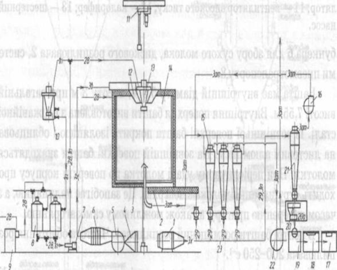 С гущенка проходит через гомогенизатор, поступает в промежуточный резервуар, откуда винтовым насосом 7 подается на распылительный диск. Частота вращения распылительного диска 200 с-1. Воздух поступает в сушильную башню нагретым до 160 °С, прямоточно с продуктом. Высушенное молоко скребковым механизмом подается в шнек 2 и транспортируется им в пневмотранспортную систему. Использование скребкового механизма позволяет уменьшить высоту камеры за счет конического дна. Транспортируя молоко, воздух его одновременно охлаждает. После циклона разгружателя 21 воздух поступает на вторую очистку в батарею циклонов 15. Молоко отводится периодически в пневмотранспортную магистраль. Производительность установки 500 кг выпаренной влаги в час. Напряжение объема сушильной башни по выпаренной влаге 5 кг/м3 час. Расходы пара на 1 кг выпаренной влаги составляют 0,3кг. Высота установки 12.5
