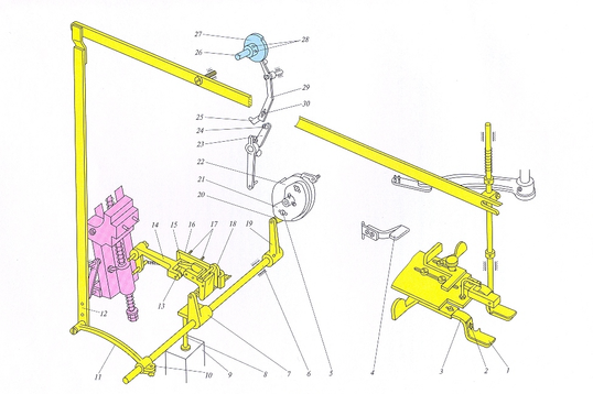 Положение по высоте собачки 25 относительно ролика 24 коромысла 23 включения приставки регулируется перемещением по прорези рычага 29 оси собачки 25 после ослабления гайки 30.