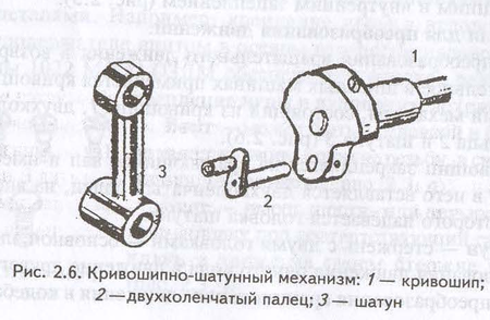 Кривошип закрепляется на вращающийся вал и имеет отверстие; в него вставляется двухколенчатый палец, на внешнее плечо которого надевается головка шатуна.