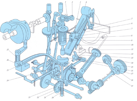 Челнок, захватывая петлю или напуск иглы, расширяет ее, обводит вокруг шпульки, осуществляет переплетение верхней и нижней нити. Механизм расположен под платформой и совершает вращательное движение.