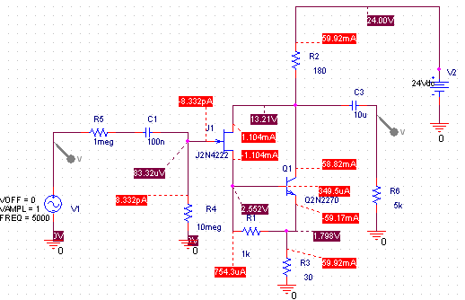 Выберем полевой транзистор. Так как напряжение питания равно Uп = +24В, то у него UCИmax должно быть больше 24В; UЗИотс > - 2B (см. выше). Одним из таких транзисторов является 2N4222: UЗИотс = - 4.1B, IСнач = 8мА, UCИmax = 30В.
