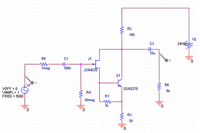Источник сигнала имеет достаточно большую амплитуду, поэтому необходимо использовать полевой транзистор (n – канальный с p-n переходом) с напряжением отсечки UЗИотс > - 2B. Лучше всего использовать составной элемент из полевого и биполярного транзисторов, что позволит увеличить невысокую крутизну полевого транзистора. Введением отрицательной обратной связи по переменному току мы добьемся температурной стабилизации.