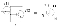 Эквивалентный транзистор VT3 работает в режиме А. Необходимое смещение обеспечивается за счёт падения напряжения на резисторе RИ: