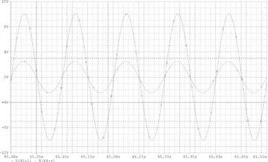 Преобразователь на всем диапазоне частот работает как усилитель. При подаче синусоидального сигнала на вход: