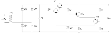 Начнём расчёт схемы источника питания с расчёта компенсационного стабилизатора напряжения.