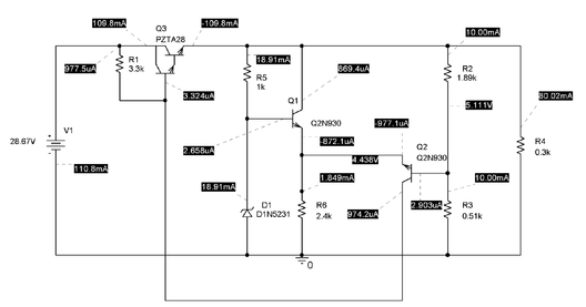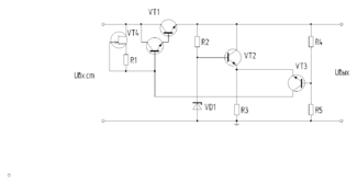 13) Предположим, что транзисторы VT2 и VT3 находятся в активном режиме (кремниевые транзисторы), и будем считать падение напряжения UБЭ1 = UБЭ2 = 0.6В для каждого транзистора. На стабилитроне падает 5.1В, примем Iб3 << Iдел,