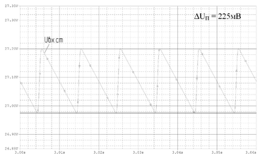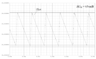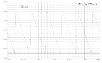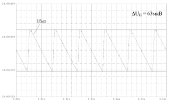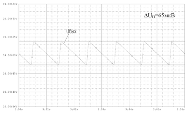 По результатам моделирования получили, что при пульсации входного напряжения ΔUПвх = 0.233В, а пульсации выходного напряжения составляют ΔUПвых = 16мВ, а необходимо добиться пульсации на выходе стабилизатора ΔUПвых = 7мВ, этого естественно можно добиться, если увеличивать емкость