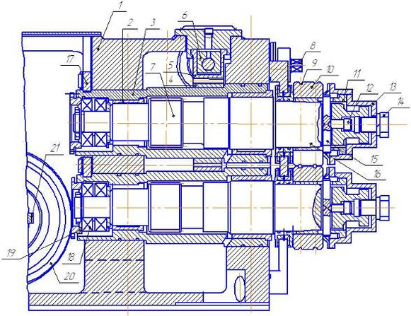 Рабочий вал (1) приводиться от электродвигателя через редуктор, имеющий максимальный крутящий момент 23 кН*м. Затем крутящий момент распределяется на рабочие валы (2) и (3) через конические шестерни (8).