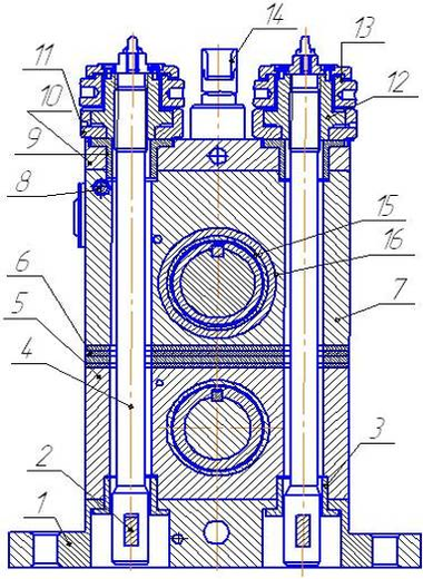Предварительная сборка клети осуществляется на стенде, расположенном вблизи стана. Положение верхнего валка по отношению к нижнему устанавливается при помощи прокладок (6) между подушками и фиксируется предварительной затяжкой болтов при навинчивании внутренних поршневых гаек (12) до упора их в наружное цилиндрическое опорное кольцо (11). Для создания предварительного напряжения системы болты-подушки в гидрогайки при помощи ручного плунжерного насоса под большим давлением нагнетается масло в пространство под поршнями (12); при этом через резьбовое соединение болты будут находиться под напряжением растяжения, а подушки под напряжением сжатия.