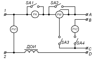 Рис. 4. Схема системы измерения электрических параметров: 1, 2 – выводы для подключения системы питания; PV1 – вольтметр для измерения напряжения питания; ДОИ – дроссель образцовый измерительный; РА амперметр для измерения рабочего тока лампы; PW – ваттметр для измерения мощности лампы; PV2 вольтметр для измерения рабочего напряжения лампы; SA1, SA2, SA3, SA4 – выключатели; А, B, C, D – выводы для подключения измеряемой лампы.