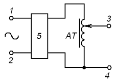 Рис. 3. Схема питания переменным током: 1, 2 – выводы для подключения источника переменного тока; 3,4 – выводы для подключения системы измерения; 5 – стабилизатор напряжения; АТ – регулировочный трансформатор.