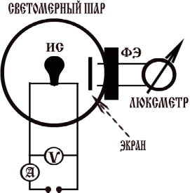 В лабораторной практике интегрирующим устройством для измерения светового потока является светомерный шар (шаровой фотометр), представляющий собой полый шар, внутренняя поверхность которого покрыта матовой краской с высоким коэффициентом отражения. Помещенный внутрь шара источник света будет создавать освещенность отдельных участков стенки шара в соответствии с характером своего светораспределения. Каждый освещенный элемент поверхности шара часть светового потока отражает на внутреннюю поверхность сферы. При этом на стенках шара кроме освещенности, создаваемой непосредственно источником света, наблюдается и освещенность от многократных отражений. Из теории известно, что освещенность, получаемая на стенках шара при многократных отражениях, одинакова для любого участка сферической поверхности, пропорциональна световому потоку источника света: