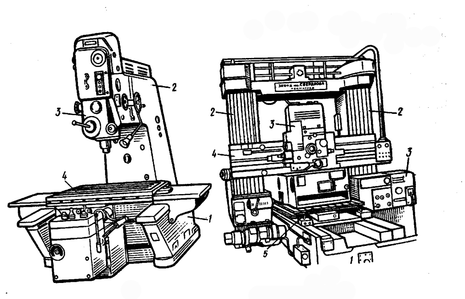 б – двухстоечный: 1 – станина, 2 – стойки, 3 – расточные головки, 4 – траверса, 5 – рабочий стол
