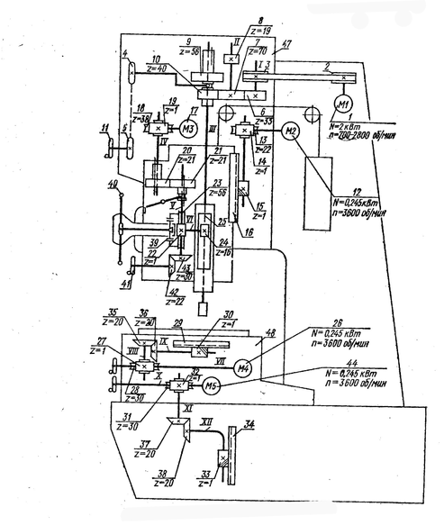 На рис.2 показана кинематическая схема станка мод. 2Д450. Цепь главного движения определяет вращение шпинделя с режущим инструментом, которое осуществляется от регулируемого электродвигателя постоянного тока 1 через ременную передачу 2-3, вал I, зубчатые колёса 6-7, вал II, колёса или 7-10 на шпиндель III. Частота вращения шпинделя изменяется бесступенчато путём регулирования электродвигателя 1 в пределах 700-2800 об/мин. Переключение ступеней частоты вращения двухступенчатой коробкой скоростей производится маховичком 11 через цепную передачу 4-5. Частота вращения контролируется тахогенератором, установленным на валу I.