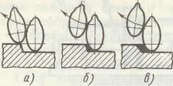 Образование риски происходит в результате внедрения режущей кромки зерна в обрабатываемую поверхность (рис.2). В первый момент зерно не контактирует с обрабатываемой поверхностью, поэтому резание не происходит и режущая кромка зерна скользит по поверхности, сжимая металл под собой (рис. 2,а). Упругое скольжение вершины зерна сменяется пластическим оттеснением металла с образованием наплывов (рис. 2,б). Далее давление кромки зерна превосходит силу сцепления между частицами металла и начинается съем стружки (рис. 2,в).