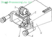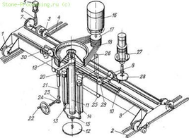 Станок модели СМР-013 предназначен для шлифовки и полировки плоских поверхностей изделий из природного камня средней твердости и твердого. Станок состоит из двух железобетонных опор с уложенными поверху рельсами, по которым перемещается мост в виде литой балки с привернутыми по краям литыми тележками. На мосту размещены гидронасосная и магнитная станции, а также площадка управления. По направляющим моста перемещается каретка (суппорт) со шлифовальной головкой. Каждая тележка имеет два опорных катка с ребордами, профили которых соответствуют профилю направляющих рельсов. Реборды воспринимают боковые усилия, возникающие при работе шлифовальной головки. Между опорами станка расположен стол в виде бетонной тумбы. Привод моста осуществляется через редуктор и реечную передачу от гидродвигателя. Последний обеспечивает регулировку скорости движения моста. Каретка приводится в движение двумя закрепленными на ее корпусе плунжерными гидроцилиндрами. Шпиндель получает вращение от электродвигателя через клиноременную передачу. Вертикальное перемещение шпинделя производится двумя гидроцилиндрами, которые обеспечивают также прижим шлифовальной головки с шлифовальником к обрабатываемой поверхности. Ход моста и каретки ограничивается при помощи конечных выключателей и передвижных упоров. В станке заложено несколько программ автоматического перемещения шлифовальной головки по обрабатываемой поверхности. Основные механизмы имеют ручной привод, облегчающий регулировку и настройку станка.