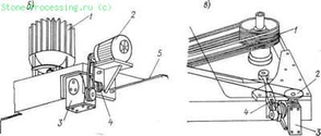 Принцип работы отдельных узлов этого станка ясен из схем на рис.3.1, а, б, в и специальных пояснений не требует. Механизм качательного движения головки (рис.3.1 в) имеет общий привод с механизмом вращения шпинделя головки. В отличие от большинства других моделей станок «Минали МС-3» не имеет системы гидравлического прижима инструмента к обрабатываемой поверхности: прижим шлифовальника к изделию осуществляется через специальную пружину путем опускания вниз шпиндельной головки. Это упрощает конструкцию станка, хотя и обусловливает определенные недостатки: сложность контроля за давлением в процессе работы, невысокое усилие прижима на операциях шлифовки гранита, снижающее производительность станка.