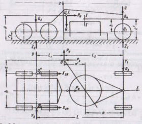 Возникающие вертикальные реакции на задний и передний мосты обозначены соответственно через Z2 и Z1. Эти реакции с учётом динамической нагрузки определяют из уравнений моментов, составляемых относительно точек О2 и О3: