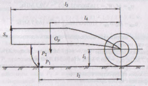 Для определения величины подъёмного усилия Sп принимаю следующее расчётное положение: отвал заглублён одним концом, производится подъём этого конца вала; на отвал действует максимальная горизонтальная составляющая реакции грунта Р1. При этом принимаю следующие допущения: вертикальная составляющая реакции грунта препятствует подъёму отвала; вес отвала с ножом, вес поворотного круга и всей тяговой рамы сосредоточены в центре тяжести системы; нагрузка воспринимается одним механизмом подъёма.