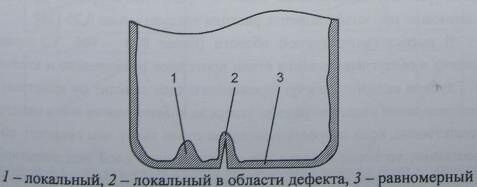 По внешнему виду и характеру распространения обезуглероженного слоя по периметру профиля можно судить о технологической стадии, на которой произошло его образование. В частности, если глубина обезуглероженного слоя крайне неравномерна по периметру, на некоторых участках полностью отсутствует, то обезуглероживание произошло при нагреве в печах под ОМД. Если глубина обезуглероженного слоя равномерна, то оно произошло при нагреве под термическую обработку или при охлаждении после ОМД. В зависимости от распределения обезуглероживания по периметру заготовки можно выделить три вида обезуглероженного слоя: равномерный, локальный и локальный в области дефекта (рисунок 2).