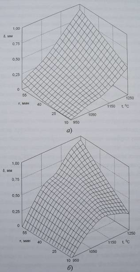 В результате исследований высокотемпературного окисления и обезуглероживания рельсовой стали в атмосфере воздуха установлено, что зависимости глубины 5, мм, обезуглероженного слоя от температуры t, °С, и времени выдержки τ, мин, для сталей марок М76 и Э76Ф существенно различаются (рисунок 3, а, б). В частности, если для стали марки М76 (без ванадия) эта зависимость близка к линейной, то для стали марки Э76Ф она носит более сложный экстремальный характер.