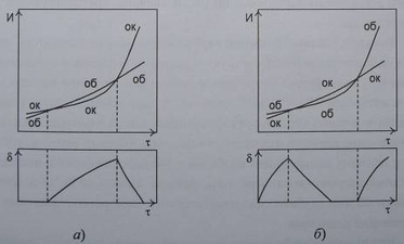 Одними из главных факторов, влияющих на динамику процессов окисления и обезуглероживания, являются температура и время нагрева, т.е. температурно-временной фактор. Различные варианты (наиболее сложные) взаимосвязанного протекания процессов окисления и обезуглероживания НЛЗ при нагреве в методической печи в случаях, когда исходный металл не окислен и не обезуглерожен, а зависимости интенсивности И окисления и обезуглероживания от времени t нагрева имеют вид, отличный от прямолинейного, схематично представлены на рисунке 3.