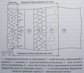 Далее можно выделить зоны полного обезуглероживания со структурой чистого феррита и частичного – со структурой, отличающейся от основной структуры металла. В рельсовой стали частичное обезуглероживание может проявляться в виде сплошной или разорванной ферритной сетки по границам зерен металла. Глубина общего обезуглероженного слоя (видимого обезуглероживания), определяемого как расстояние от поверхности металла до основной (неизмененной) структуры металла, равна сумме глубин зон полного и частичного обезуглероживания. При аналитических расчетах и компьютерном моделировании могут использовать понятие суммарного обезуглероженного слоя, который больше видимого на величину толщины металла, перешедшего в окалину, поскольку окисленный металл также был обезуглерожен. В зависимости от режима нагрева, состава атмосферы и других факторов некоторые зоны (слои) могут отсутствовать.