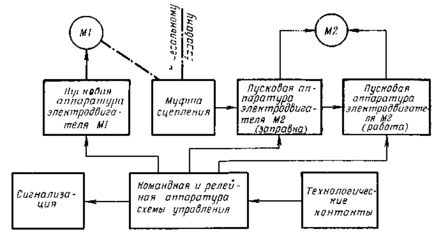 При всех нарушениях технологического процесса отключается электродвигатель М2 и зажигается сигнализация. После устранения технологических неполадок пуск электродвигателя М2 производится в приведенной выше последовательности.