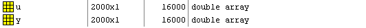 После выполнения команды в рабочей области появились массив входных переменных u и массив выходного параметра y.