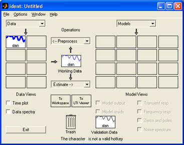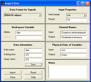 В результате выполнения этой команды появляется диалоговое окно показанное на рисунке 2.1.2. На начальной стадии идентификации с использованием графического интерфейса после проведения эксперемента необходимо сформировать файл данных, в нашем примере таким файлом является dan.