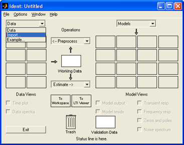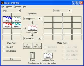 Для дальнейшего использования полученных исходных данных необходимо провести предварительную обработку этих данных с целью удаления тренда из набора данных и если необходимо отфильтровать данные с помощью имеющихся средств в пакете System Identification Toolbox. Данные операции проведем в графическом интерфейсе System Identification Toolbox, который запускается из командной строки командой: