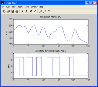 В результате проведенного эксперимента был получен массив данных состоящий из 2 тысяч значений входного параметра (скорость вытягивающей пары, м/с) и 2 тысяч значений выходного параметра (линейная плотность, ктекс). Интервал дискретизации равен 2.5 (ts=2.5). Для загрузки в рабочую область MATLAB массива данных необходимо выполнить команду: