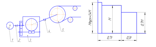 5-барабан. Движение от электродвигателя через муфту передается на входной вал редуктора, далее, через цилиндрическую косозубую передачу 1-2 на промежуточный вал 2-3 редуктора и, затем, через червячную передачу 3-4 на выходной вал 4 редуктора, затем через муфту на приводной барабан.