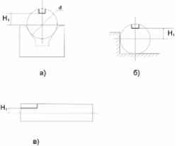 Рассмотрим варианты схем базирования заготовки при обработке шпоночного паза (рис. 6.2.). Для первого варианта (рис. 6.2 а). При установке заготовки в призмы погрешность базирования (еᵷ) будет определяться по формуле: