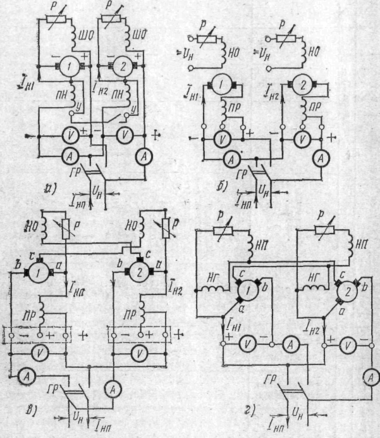 Мал. 7. Схема включення зварювальних генераторів на паралельну роботу: а — багатопостових, б — однопостових з незалежним збудженням і що послідовною розмагнічує обмотками, в — однопостових з паралельною намагнічуючою і послідовною розмагнічуючою обмотками|, г — однопостових з розщепленими полюсами; ШО — шунтова обмотка, ПН| — що послідовна намагнічує, НО — намагнічуюча обмотка, НП| — намагнічуюча поперечних полюсів, ПР— послідовна розмагнічуюча, НГ| — намагнічуюча головних полюсів, P — реостат, ГР — груповий рубильник, V — вольтметр, А — амперметр. ІН1, ІН2— струми навантаження окремих генераторів ІНП— струм навантаження при паралельному включенні , Uн| — напруга холостого ходу при паралельному включенні